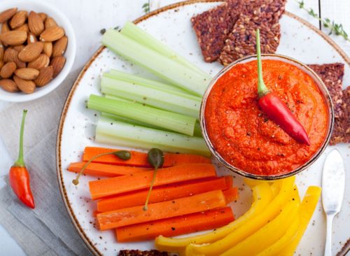 Craving crunchy chips and dip? Skip the fried tortillas and cut up some vegetables instead to load up on fiber and slow down your consumption. Low in calorie, and just as crunchy — sliced bell peppers, celery sticks, and sweet baby carrots are sure to do the trick.